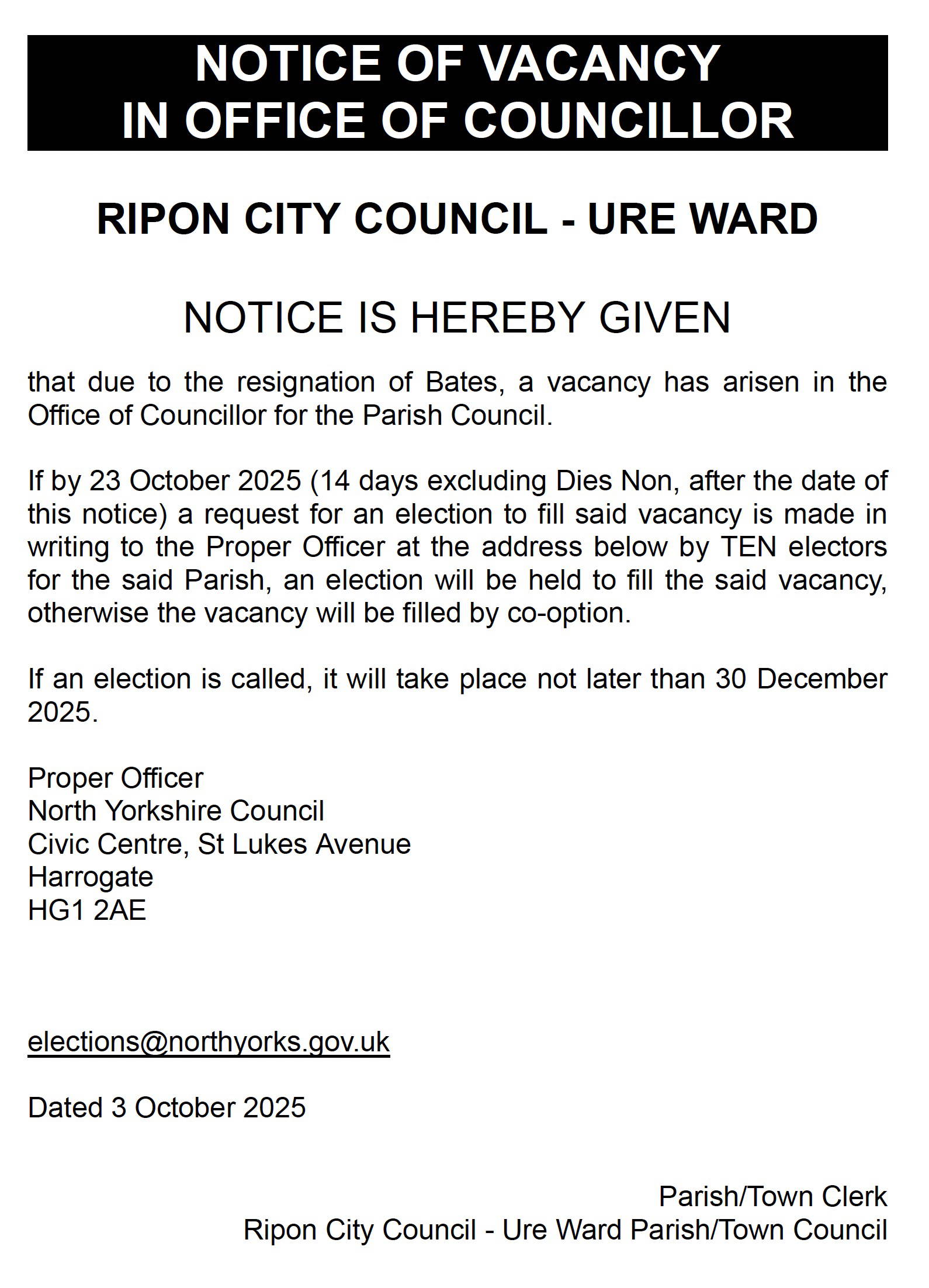 Ripon City Council comprises 12 councillors across four wards; ‘all out’ elections are usually held every four years.